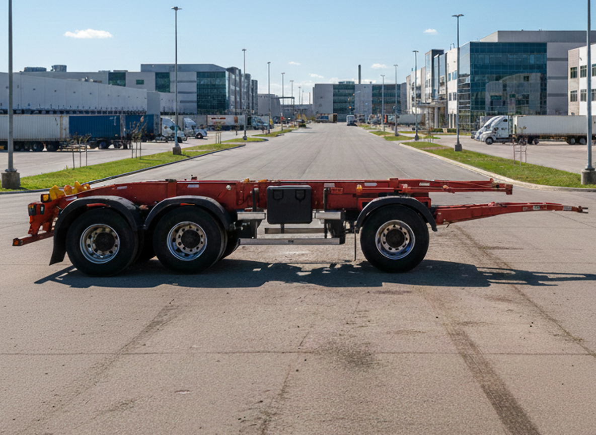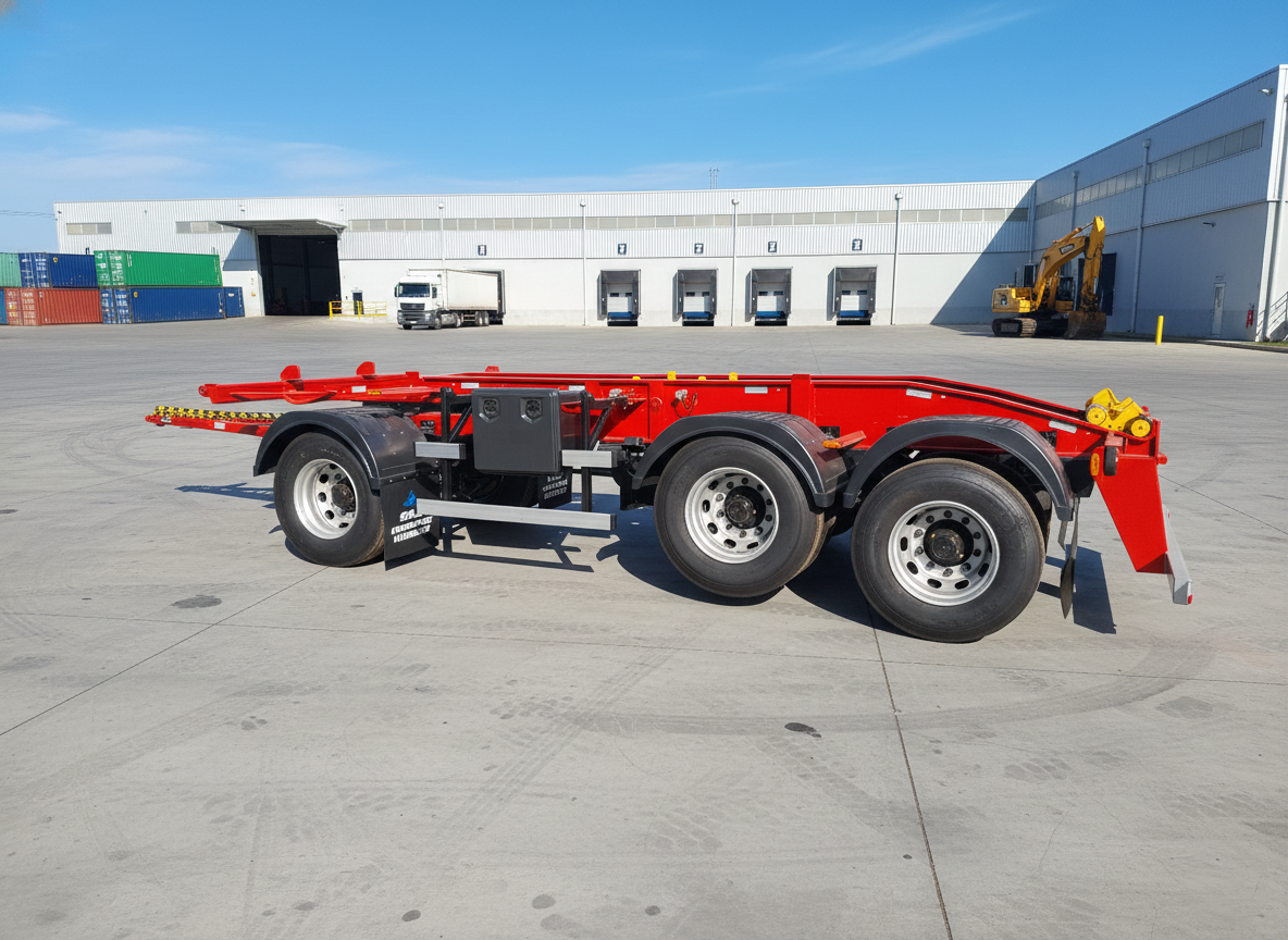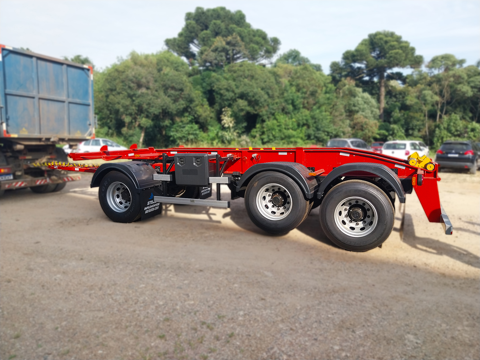 Reboque Julieta, modelo 03 (Tres) eixos, PBT homologado de 20.000 à 27.000kg, sistema de carrinho para transportes de container Roll-on Roll-off, fabricada em chapa de aço carbono conforme norma SAE 1010/20, eixo dianteiro construído e maço especial SAE 1045, eixo traseiro construído em aço SAE 1045, suspensão traseira confeccionada em chapas de aço, obedecendo as normas de segurança, feixe de molas de 90mm, pára-choque atendendo as normas de segurança veicular, sistema de freios com ABS, e estacionários e sistema de trava de segurança pneumática, sem pneus, fundo primer anti-corrosivo e pintura acabamento em PU (poliuretano), na cor padrão do cliente, rodas para pneus com ou sem câmara, engate rápido nas mangueiras, com protetor lateral retrátil, conforme RESOLUÇÃO CONTRAN 323/09, kit de sinalizadores laterais em led conforme RESOLUÇÃO CONTRAN 227/07, lanternas traseiras com pisca sequencial, suporte para estepe, caixa de ferramenta, com corote d’água.